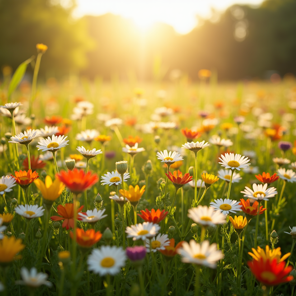 Bright flowers fill the field as the sun rises. Different colors create a vibrant scene. Bees and butterflies enjoy the warm day.