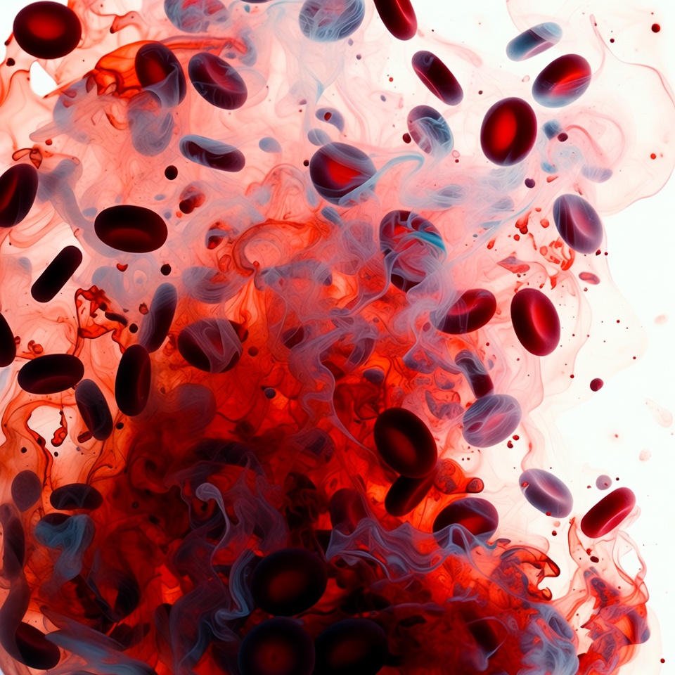 Red liquid mixes with vapor, creating movement and patterns. Dark round shapes float amidst the swirling colors.
