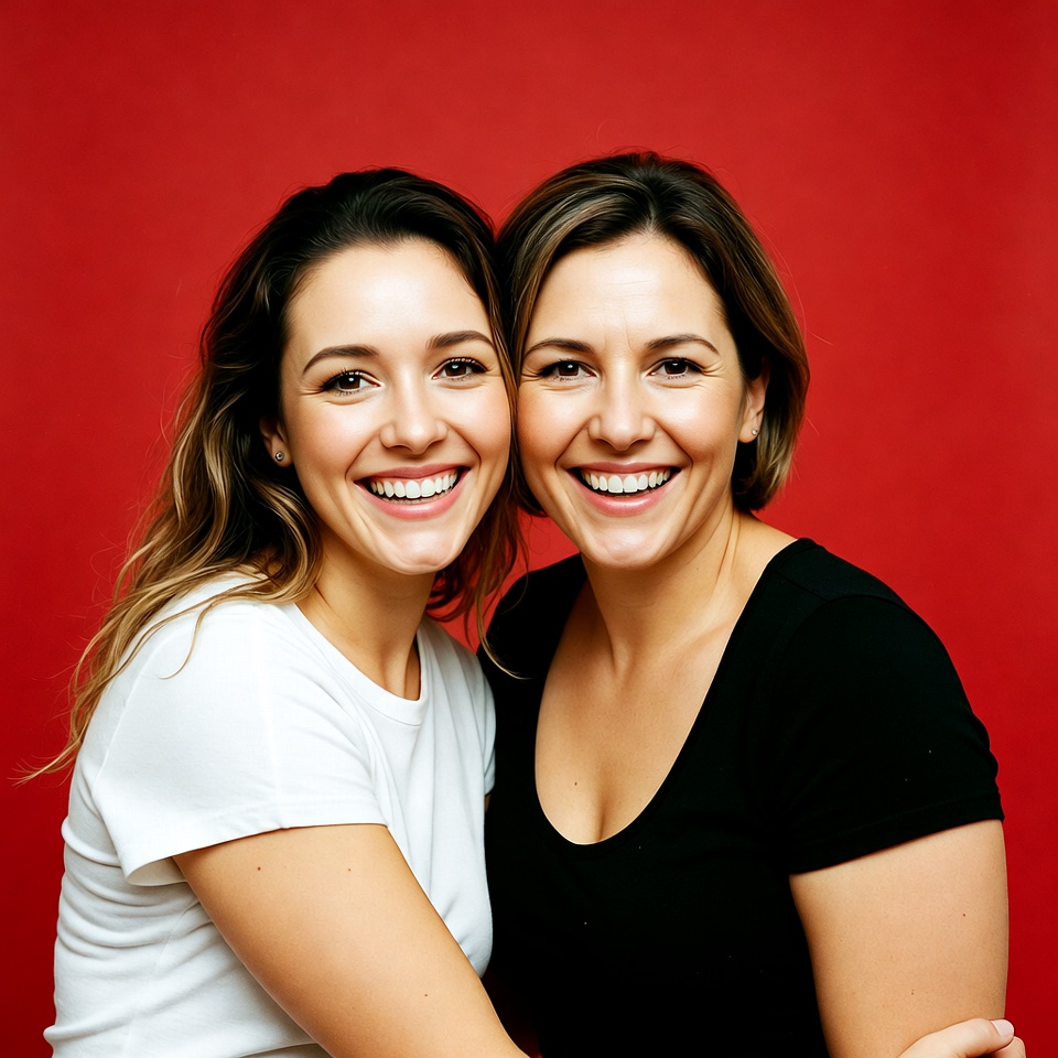 bright colors, candid, casual clothing, close up, expressions, female friendship, friends, fun, happiness, joyful moment, laughter, natural poses, portraits, red background, simple backdrop, smiling, togetherness, two people, warm smiles, women