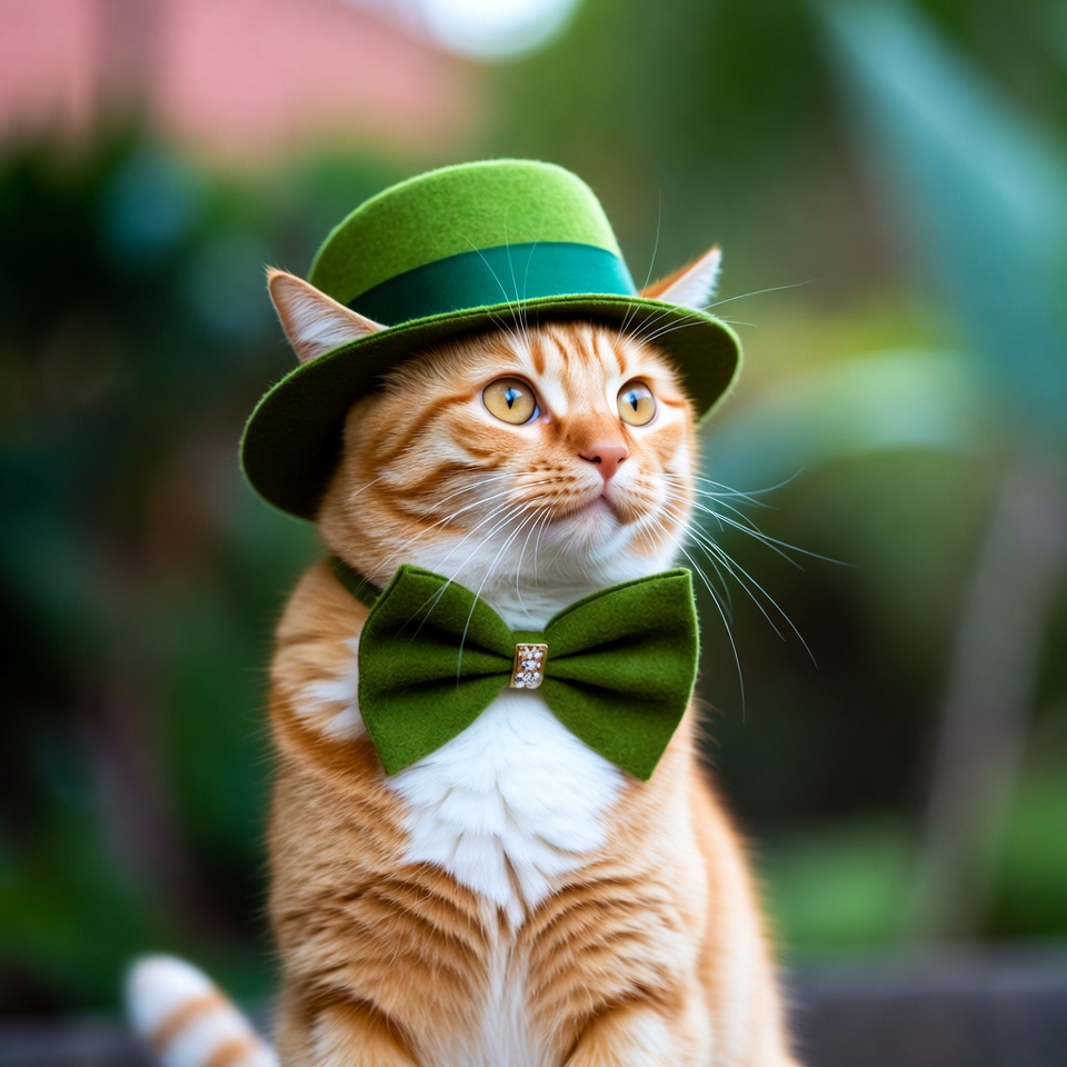 A cat sits outdoors wearing a green hat and bow tie. The background features blurred greenery. The scene has a fun atmosphere.