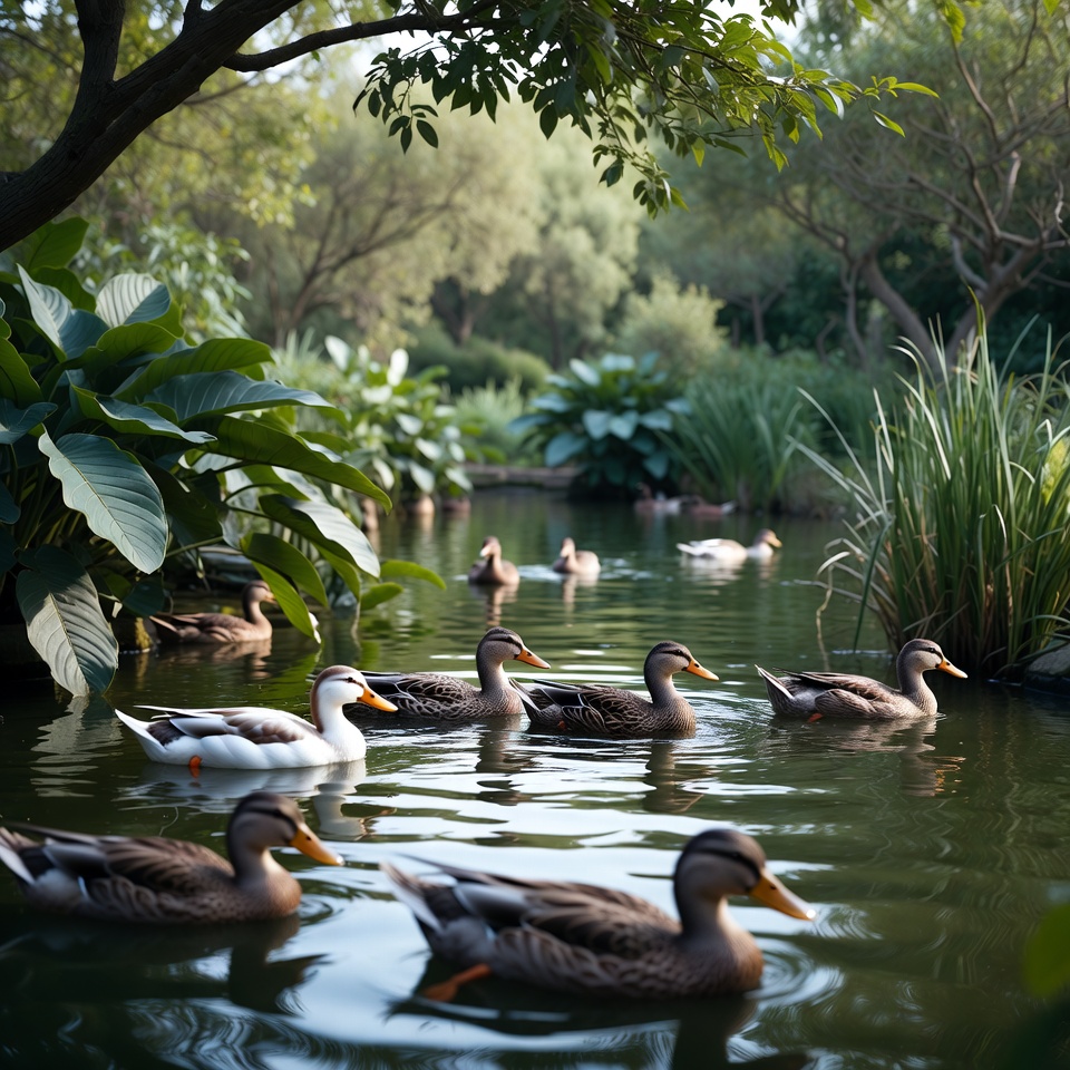 Ducks glide through a green pond surrounded by lush plants under bright daylight. Other ducks swim nearby in a peaceful setting.