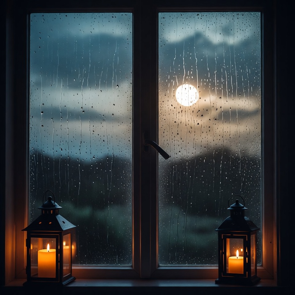 Rain falls on a window with two lanterns lit beside it. The moon is visible in the background, creating a night scene.