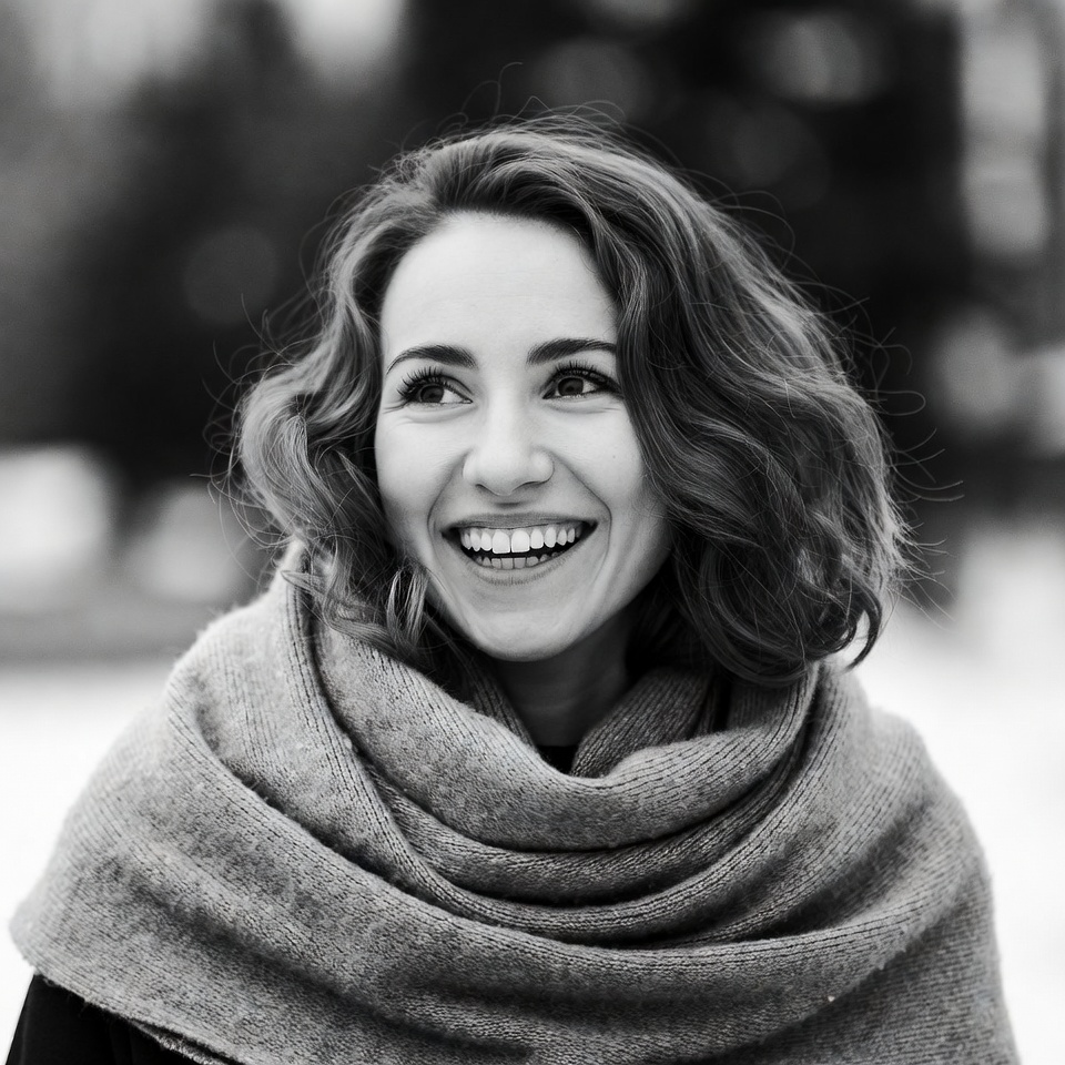 beauty, casual, close-up, daylight, expression, fashion, hairstyle, happy, joy, nature, outdoors, personal, shawl, smile, snow, snowy, sunlight, warmth, winter, woman