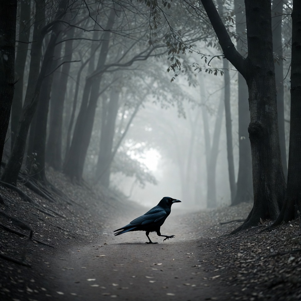A crow walks along a narrow path in a forest. Trees surround the path and mist fills the air, creating an eerie atmosphere.