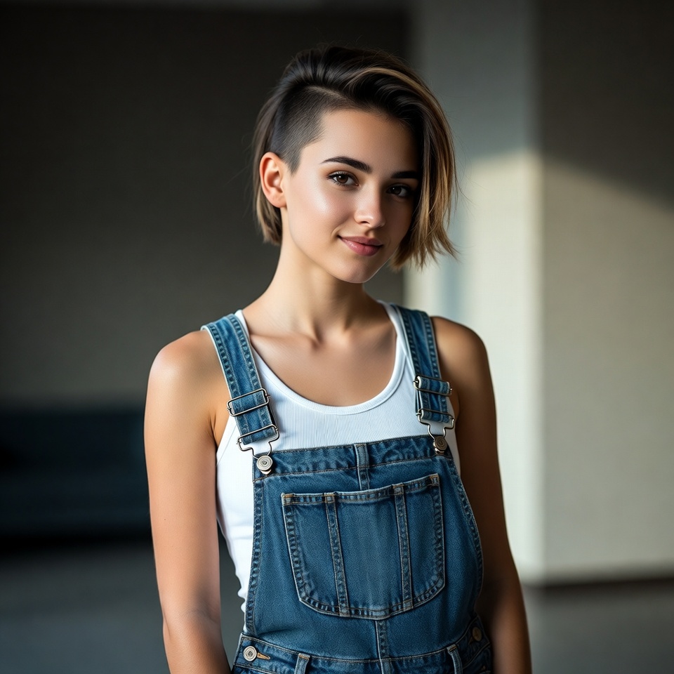 beauty, casual wear, cozy, denim, fashion, features, girl, hairstyle, indoor, indoors, light, modern, overalls, relaxed, room, standing, style, tank top, woman, young