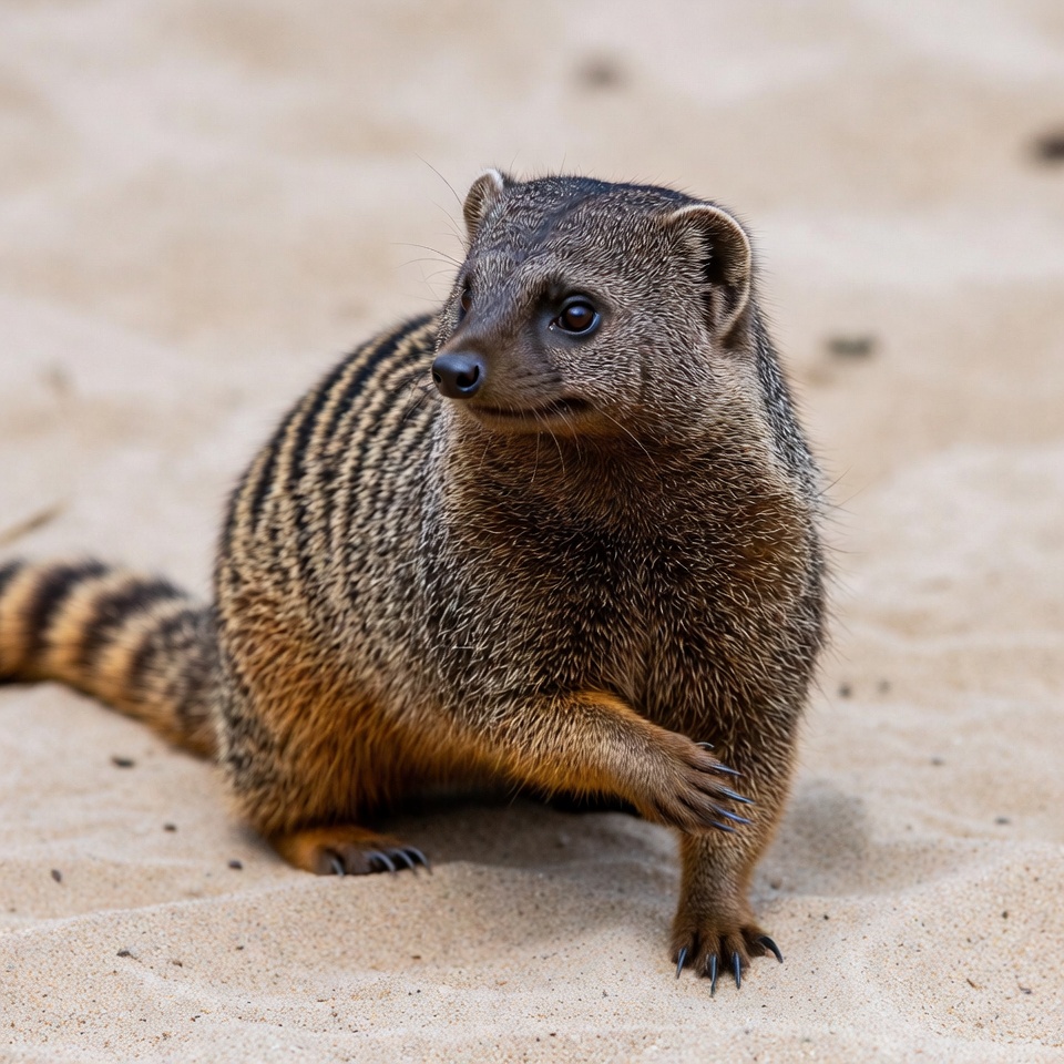 A mongoose explores the sandy terrain. Its striped tail and curious gaze show its alert nature in the wild.