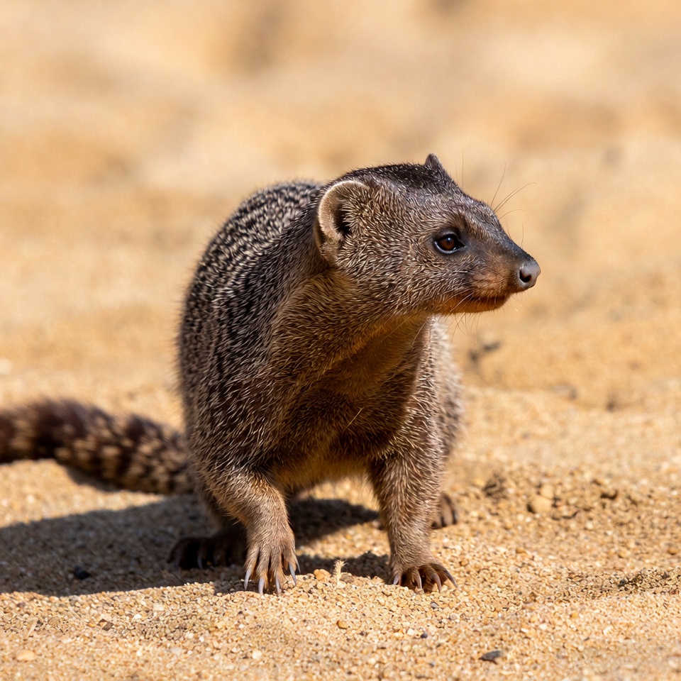 A small mongoose stands on sandy terrain under sunlight, observing its surroundings and looking for food, a common scene in its habitat.