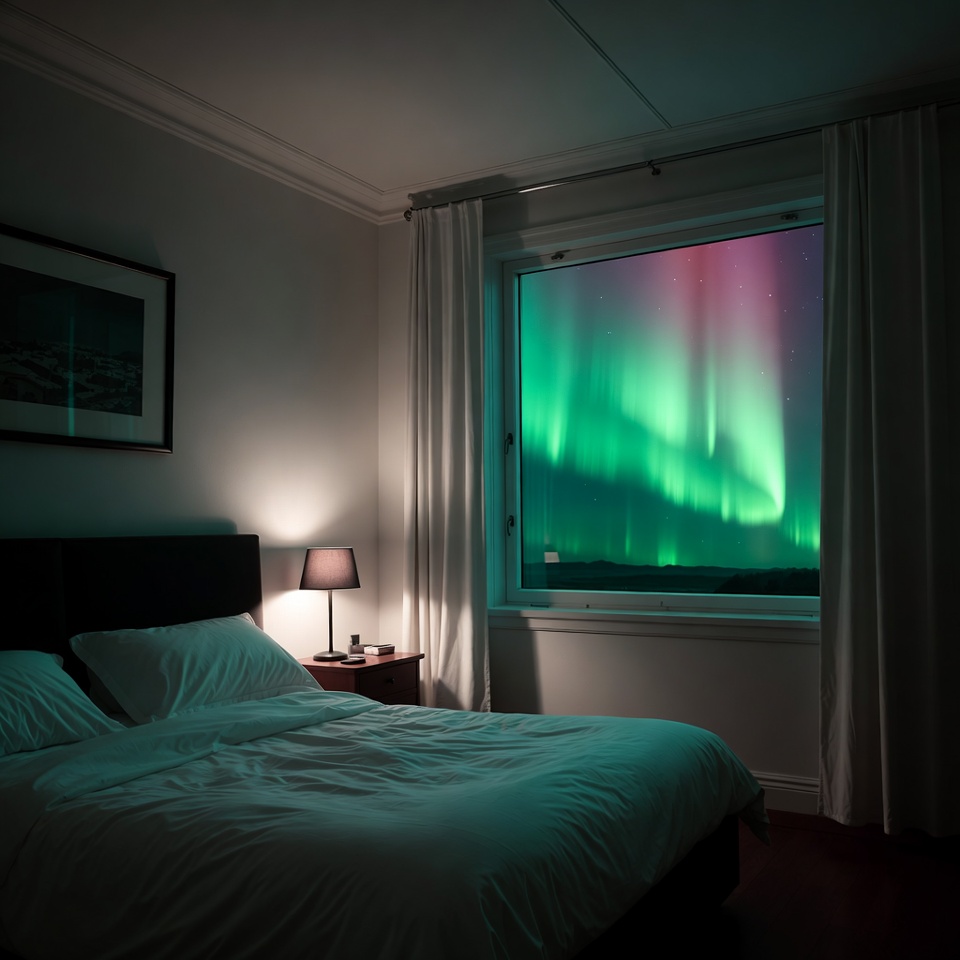 Bright colors of the northern lights shine through a bedroom window at night. A bed with white sheets is visible in the cozy space.