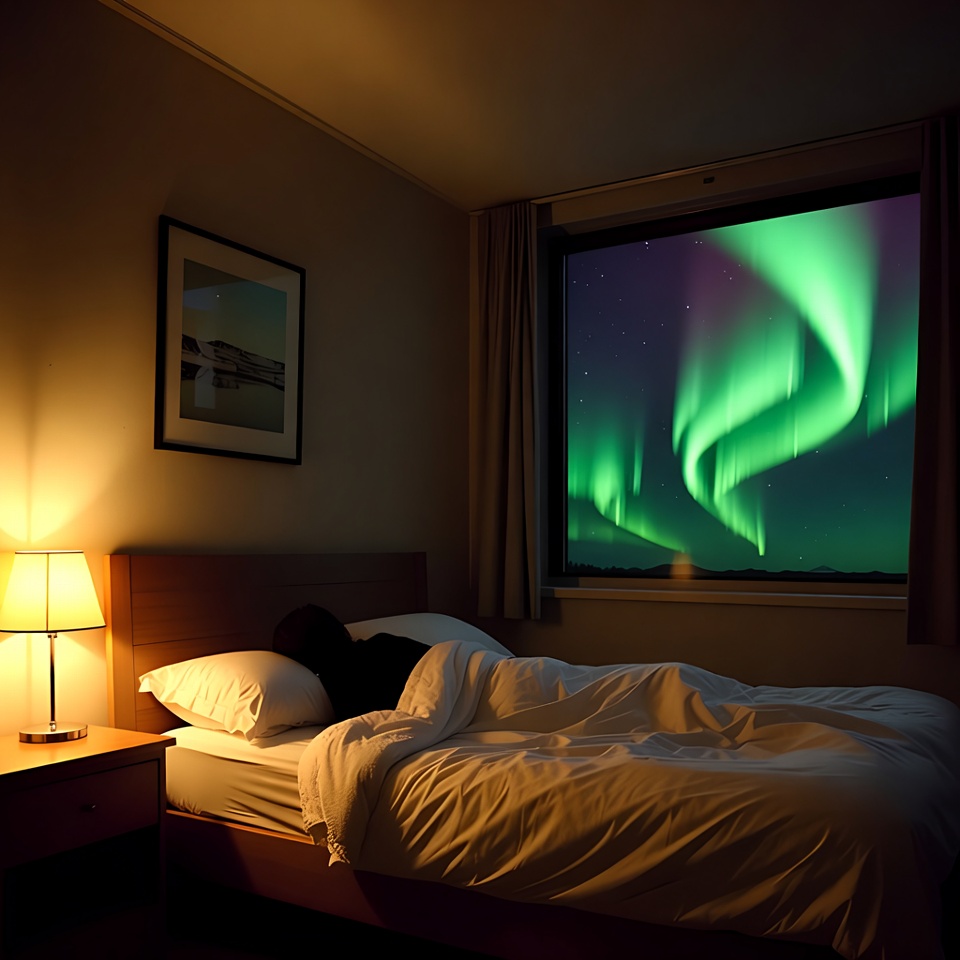 A person sleeps in a bed while northern lights glow outside the window. The room is dimly lit by a bedside lamp.