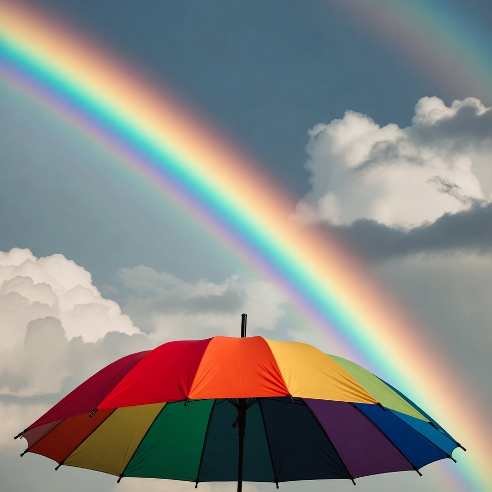 A rainbow stretches across the sky with fluffy clouds under a colorful umbrella. The scene captures a bright moment after rain.