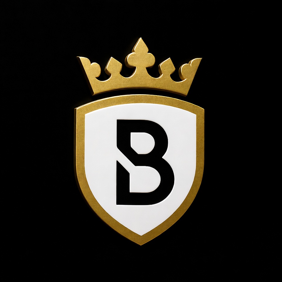 A logo shows a shield with a letter B and a golden crown on top. The design is simple, bold, and recognizable against a black background.