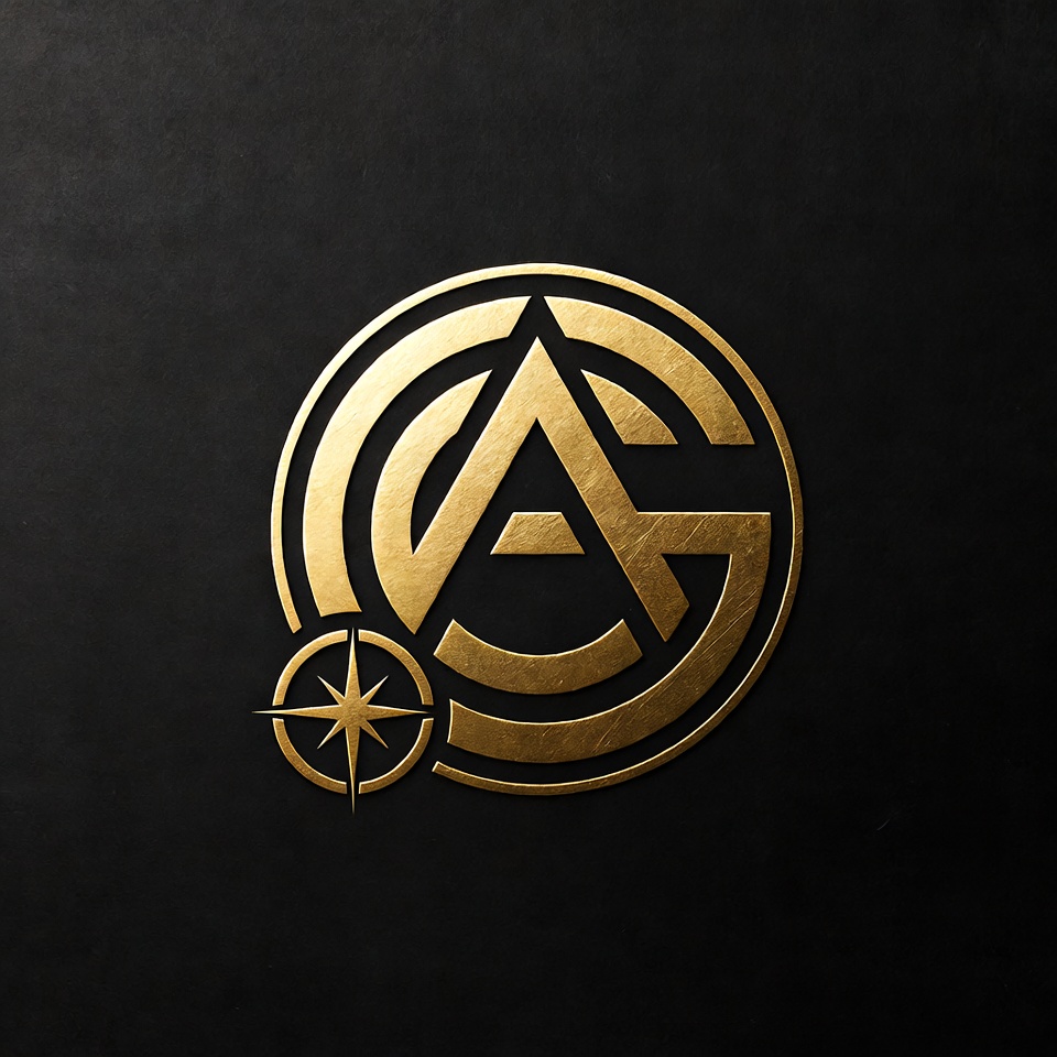 A circular logo design features bold lines and a compass element. The logo is displayed on a dark background to highlight its details.