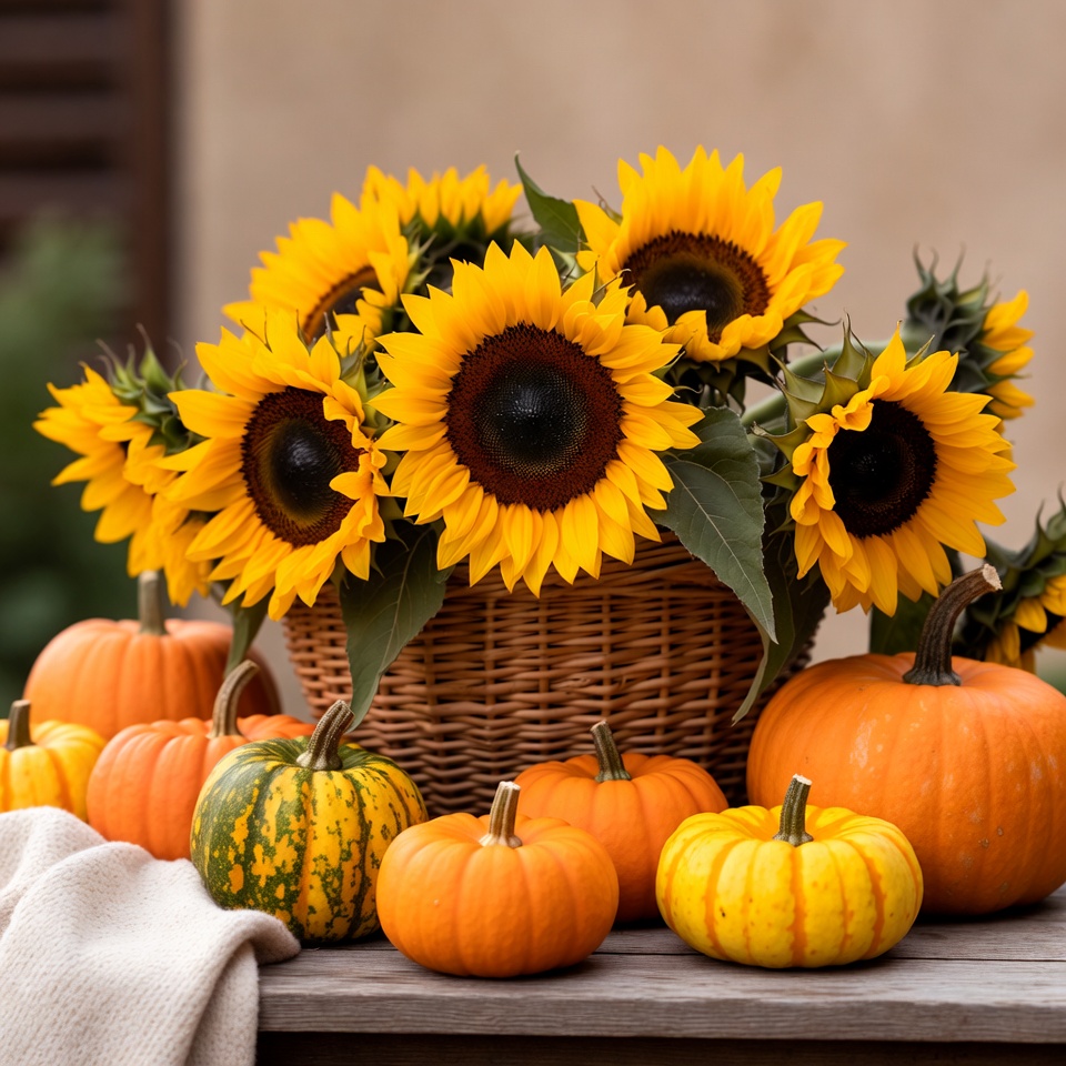 A basket of sunflowers rests on a table surrounded by various pumpkins. This scene captures autumn colors and seasonal decorations.