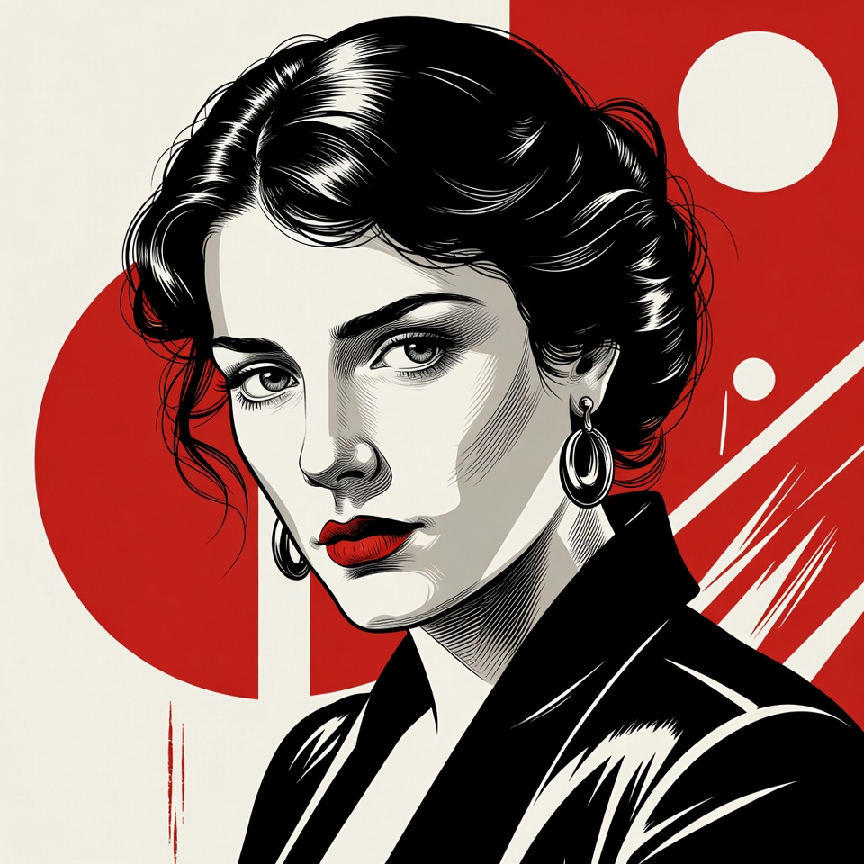 art, beauty, black outfit, bold background, color contrast, confident, dark hair, design, earrings, elegant, expression, fashion, graphic, illustration, portrait, red lips, retro, style, visual art, woman