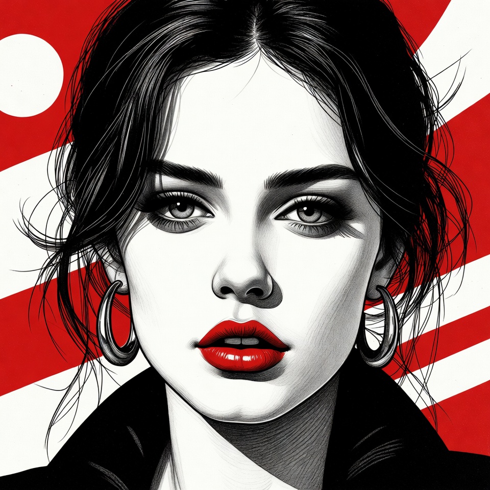 artistry, background, beauty, bold, character, colors, cultural, dark hair, design, elegance, expression, fashion, features, glamour, graphic, makeup, portrait, red lips, style, woman