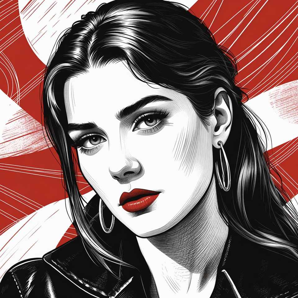 A young woman poses confidently against a vivid background. Her makeup is striking, and she wears stylish earrings and a leather jacket.