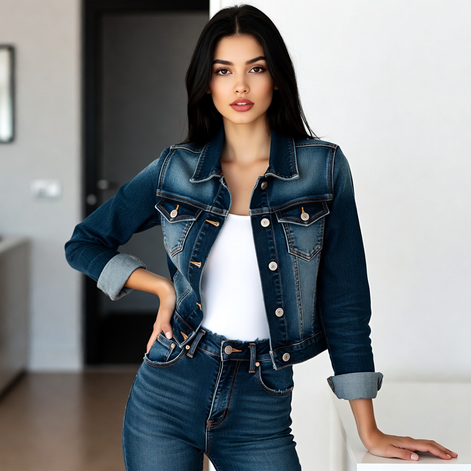 A woman stands stylishly in a denim jacket and jeans, showcasing her confident pose in a modern indoor setting.