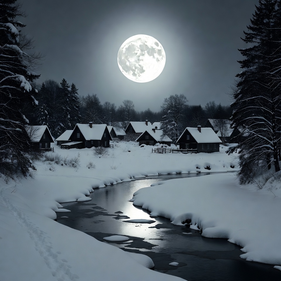 Snow covers the ground in a village at night. A bright moon shines over the houses and reflects on a calm river.