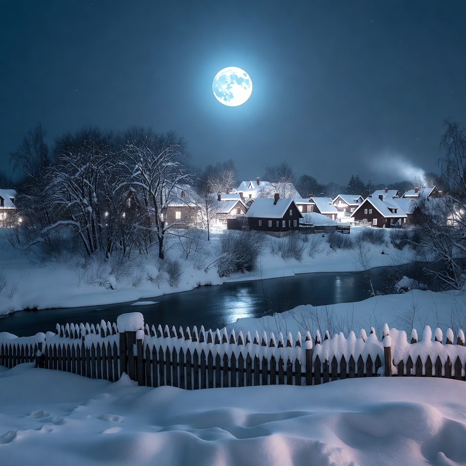 Snow covers the village and landscape under a bright moon. Houses light up the night by the river, creating a cozy winter scene.