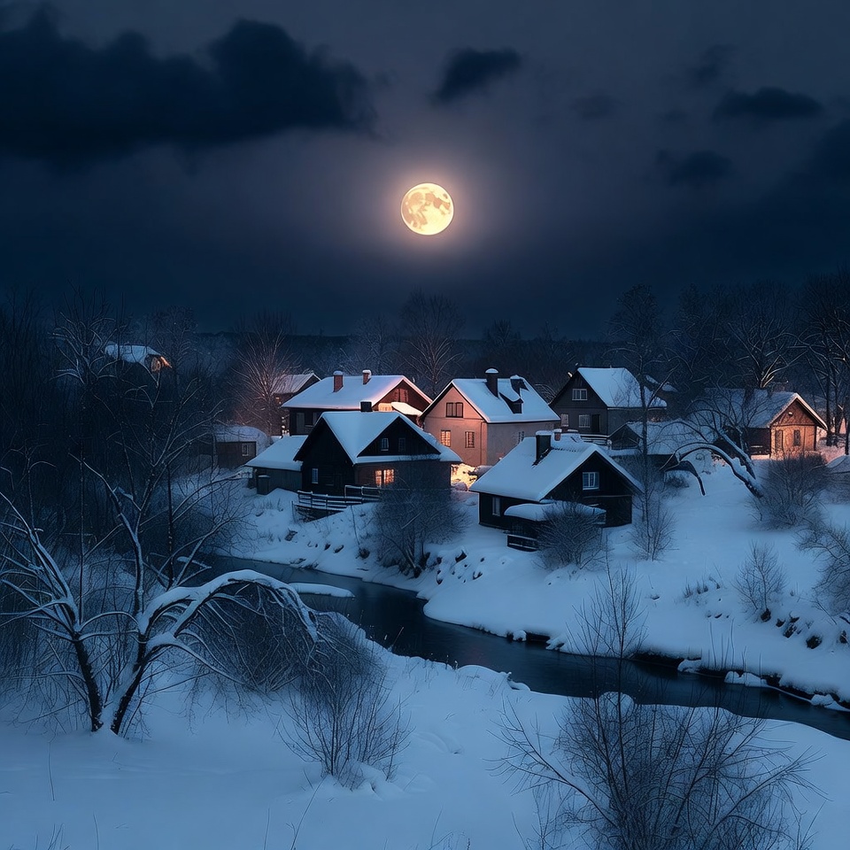 Snow covers houses in the village as a full moon lights up the night sky. Trees and a river add to the winter scene.