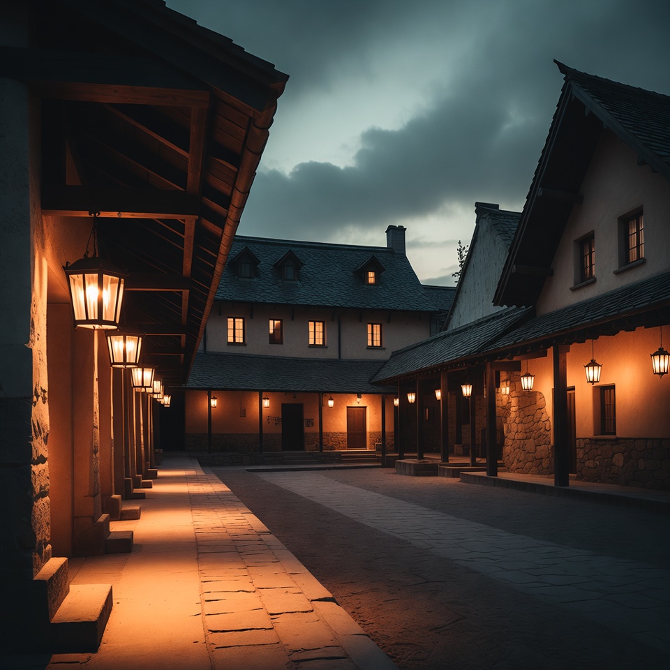 A historic courtyard with buildings and lanterns lit during the evening. Soft light glows from windows, creating a warm atmosphere.