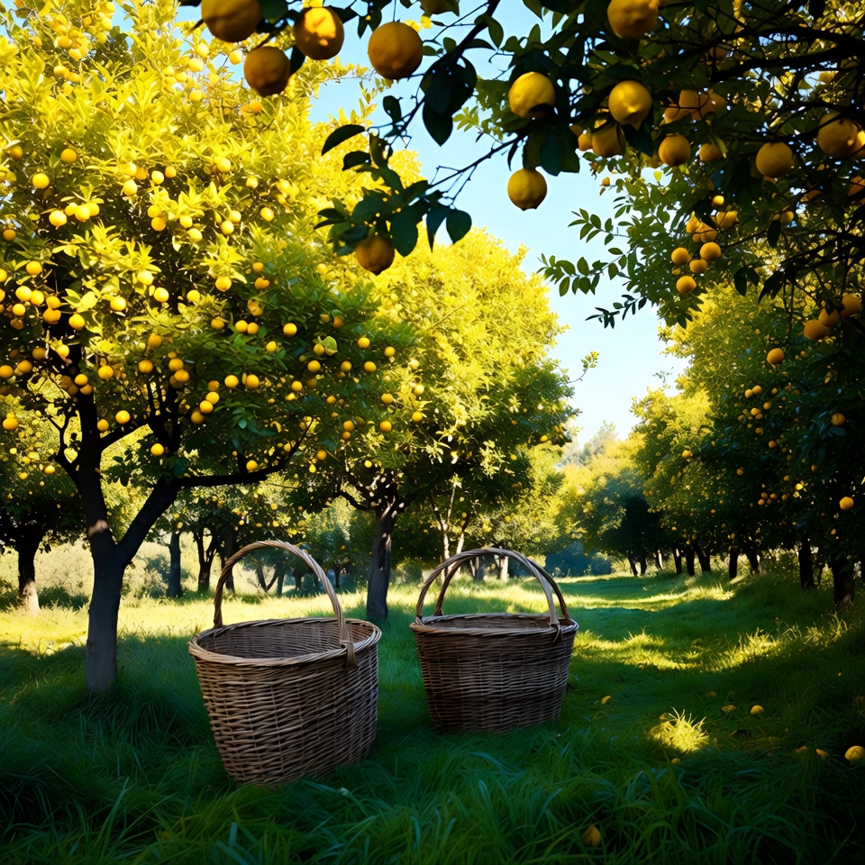 agriculture, baskets, countryside, farming, fruit, gathering, grass, growth, harvest, lemon, nature, orchard, outdoors, ripe, rural, seasonal, summer, sunlight, trees, yellow
