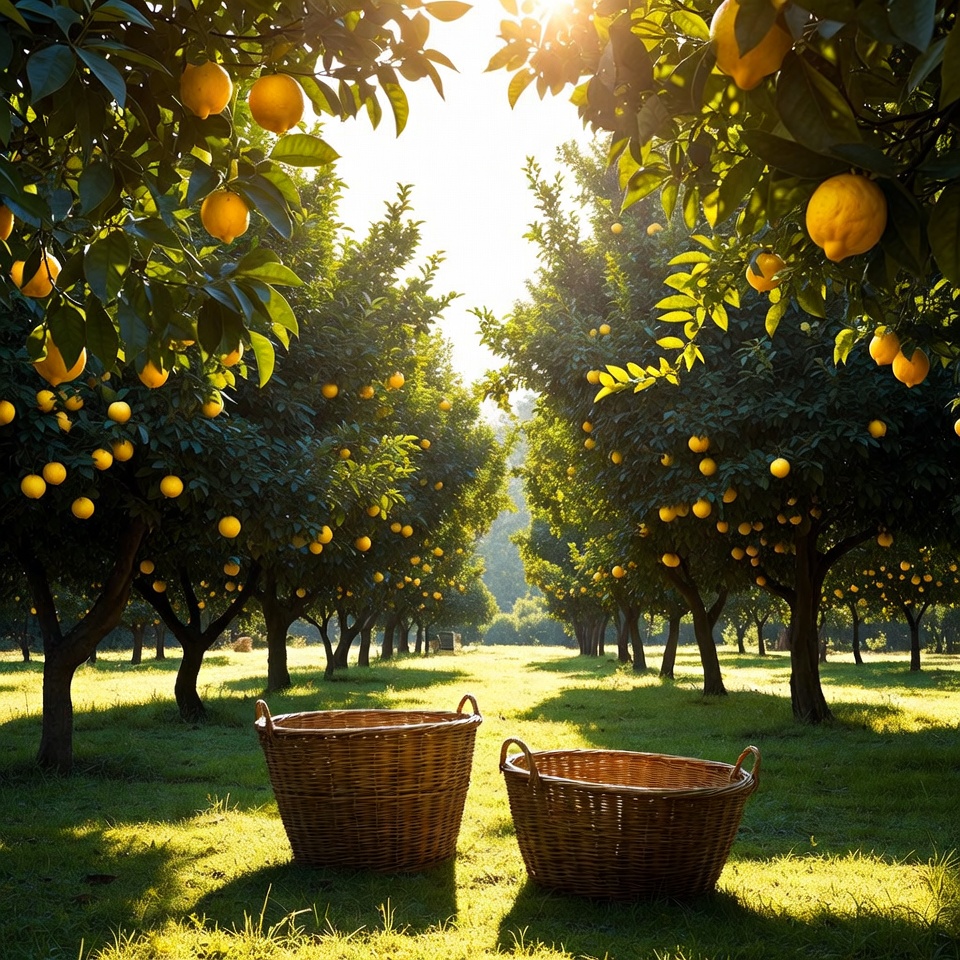 Two baskets sit in a lemon orchard during sunset. The sun shines through trees filled with ripe lemons.