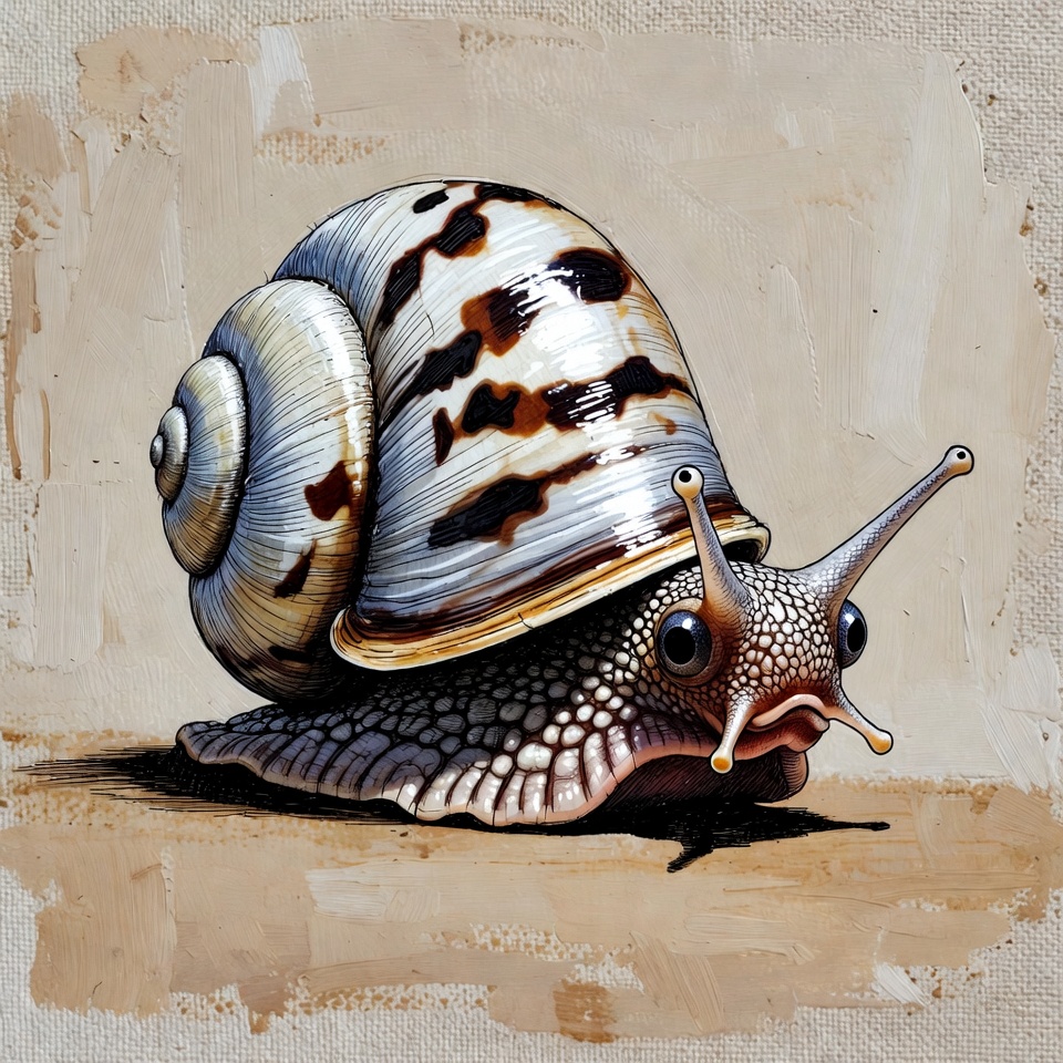 A snail crawls on a textured surface. The snail has a shell with distinct patterns and a dark body. It moves slowly in a quiet setting.