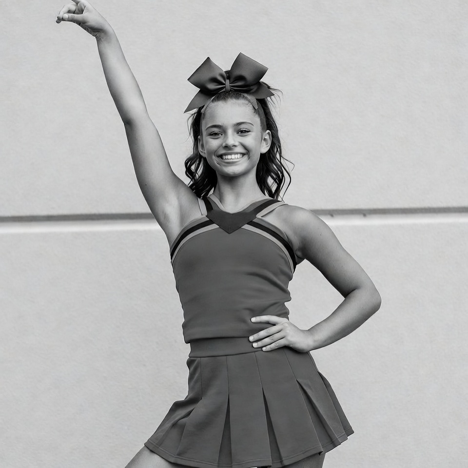 activity, athletic, bow, celebration, cheer, cheerleader, competition, dance, energetic, event, excitement, fun, outdoors, performance, pose, smiling, sport, team, uniform, youth