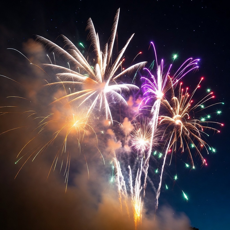 Bright fireworks light up the night sky during a celebration. Various colors burst and create shapes above. Smoke rises from the ground.