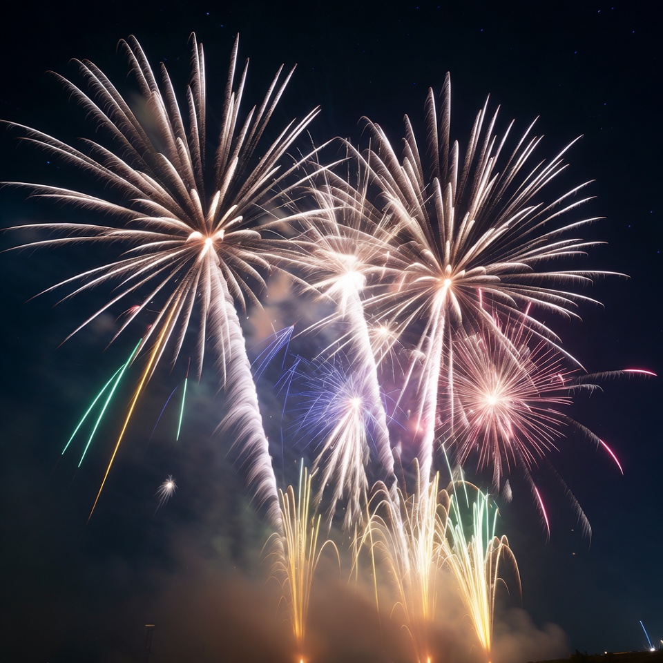 Fireworks burst in various colors above a dark sky, illuminating the scene during a nighttime celebration. The display attracts attention and cheers.
