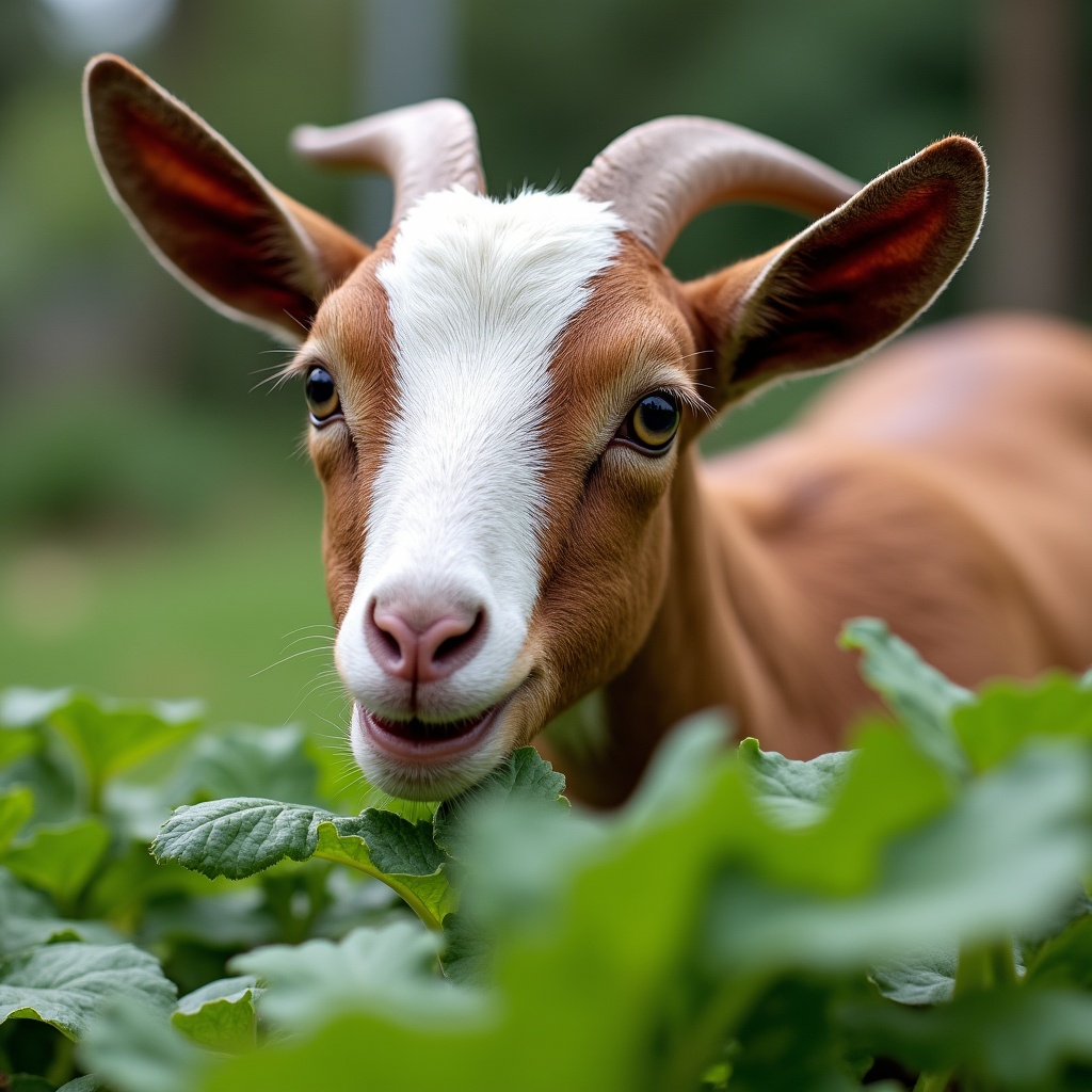 agriculture, animal, brown fur, close-up, domestic, farm, feeding, garden, goat, grazing, greenery, herbivore, leaves, nature, outdoors, pet, plants, rural, white markings, wildlife