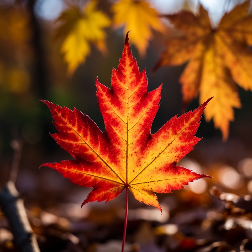 A red maple leaf stands out against a blurred background of other leaves during autumn. Sunlight highlights its color and details.