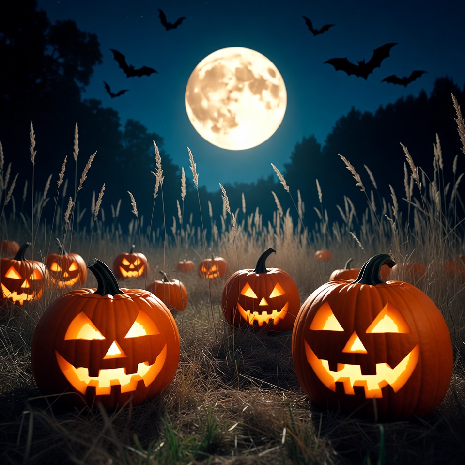 Jack-o'-lanterns are placed in a field under a full moon. Bats fly in the night sky. It is dark, creating a spooky atmosphere.