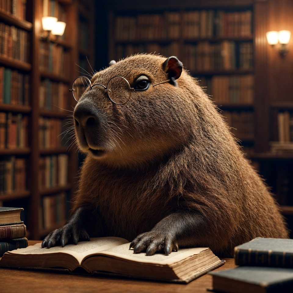 A small animal sits at a table in a library with books. It wears glasses and looks focused on an open book in front of it.