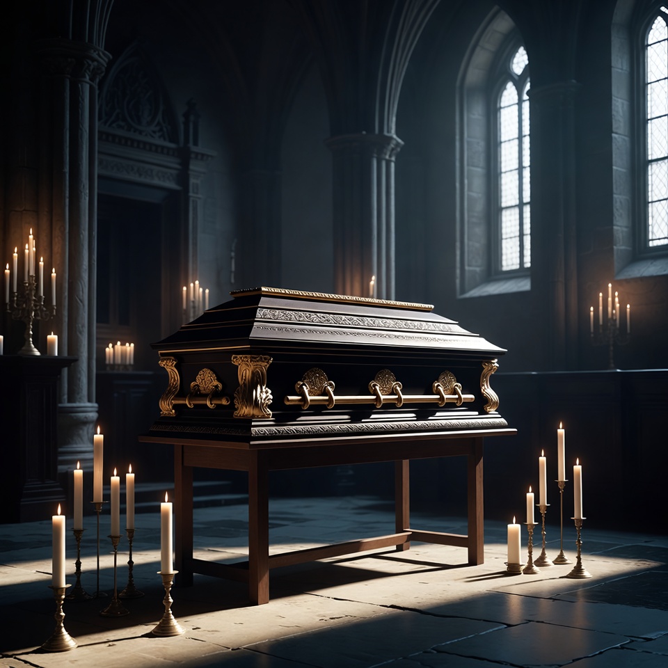 A coffin sits in a dark chapel surrounded by candles. Light streams through stained glass windows. The atmosphere feels somber.