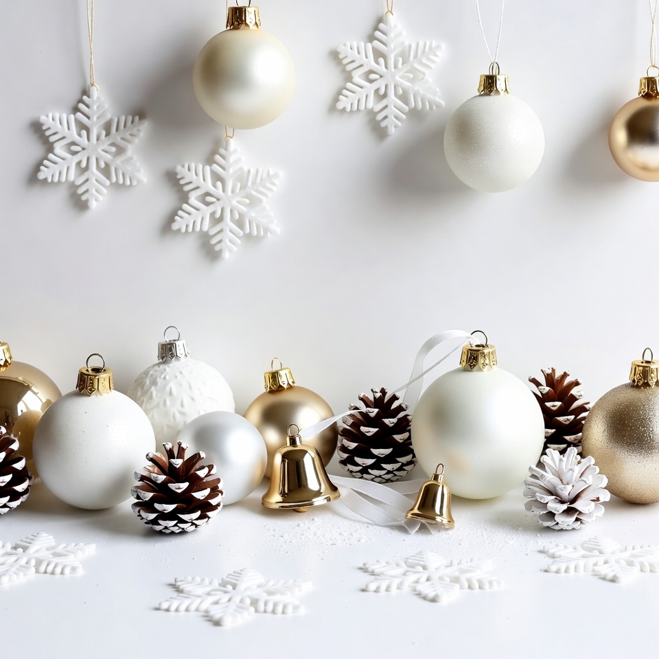 Ornaments, snowflakes, and pinecones arranged on a white surface for winter celebrations. Items create a festive atmosphere with holiday charm.