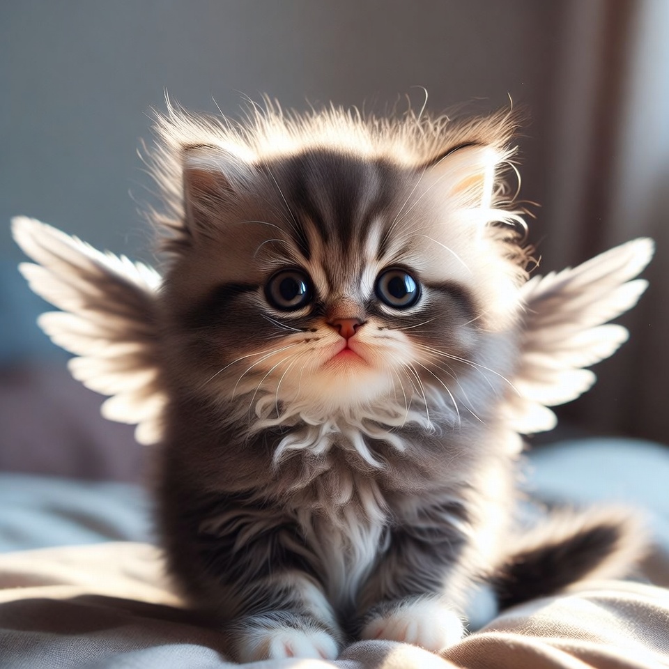 A small cat with fluffy fur and wings sits on a bed, looking curiously at the viewer in soft light from a nearby window.