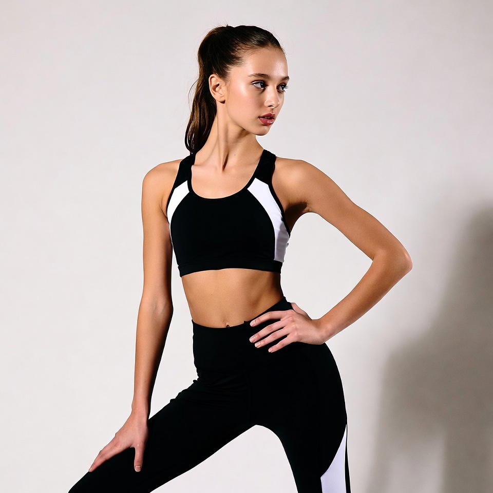 activewear, athletic, black, confident, fashion, fitness, girl, healthy, indoors, model, movement, outfit, pose, sport, sportswear, standing, studio, style, white, woman