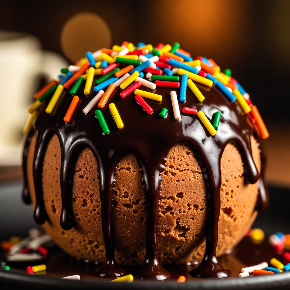 A round chocolate dessert topped with colorful sprinkles sits on a black plate. The dessert has a shiny chocolate sauce dripping down.