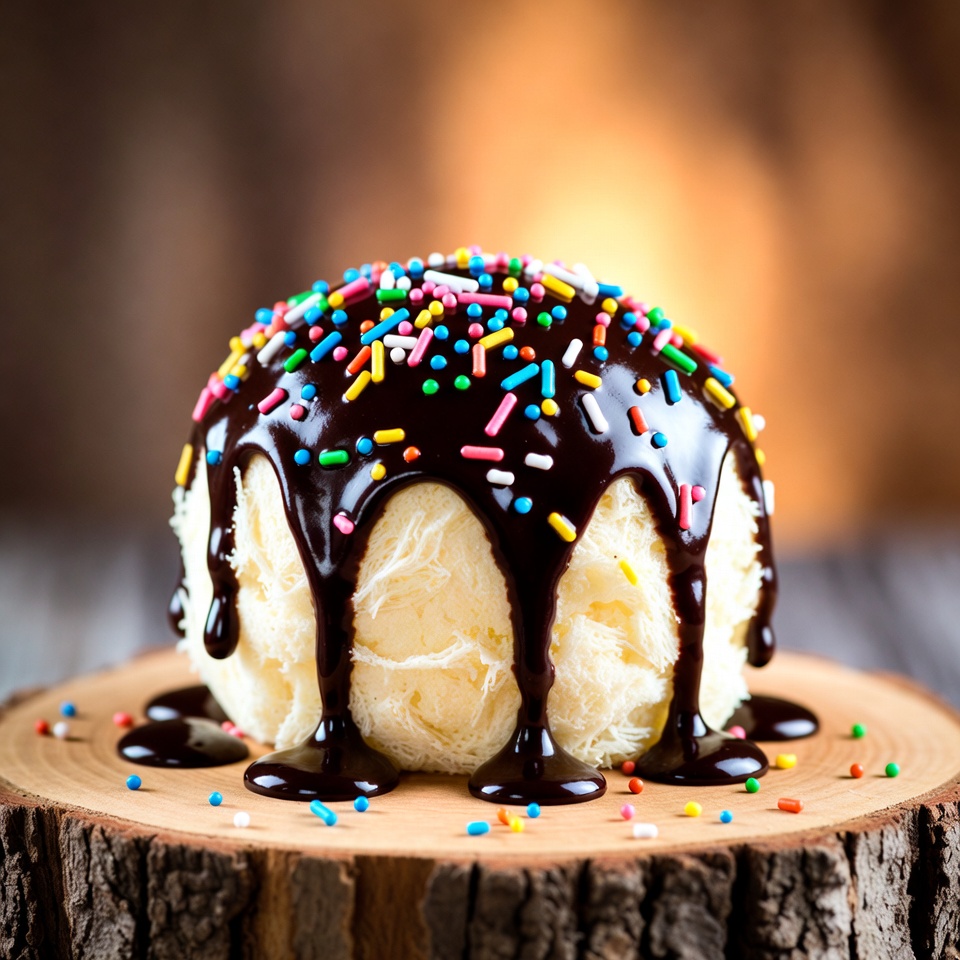 Ice cream sits on a wooden slice. It is topped with chocolate sauce and colorful sprinkles. The background has soft lighting.