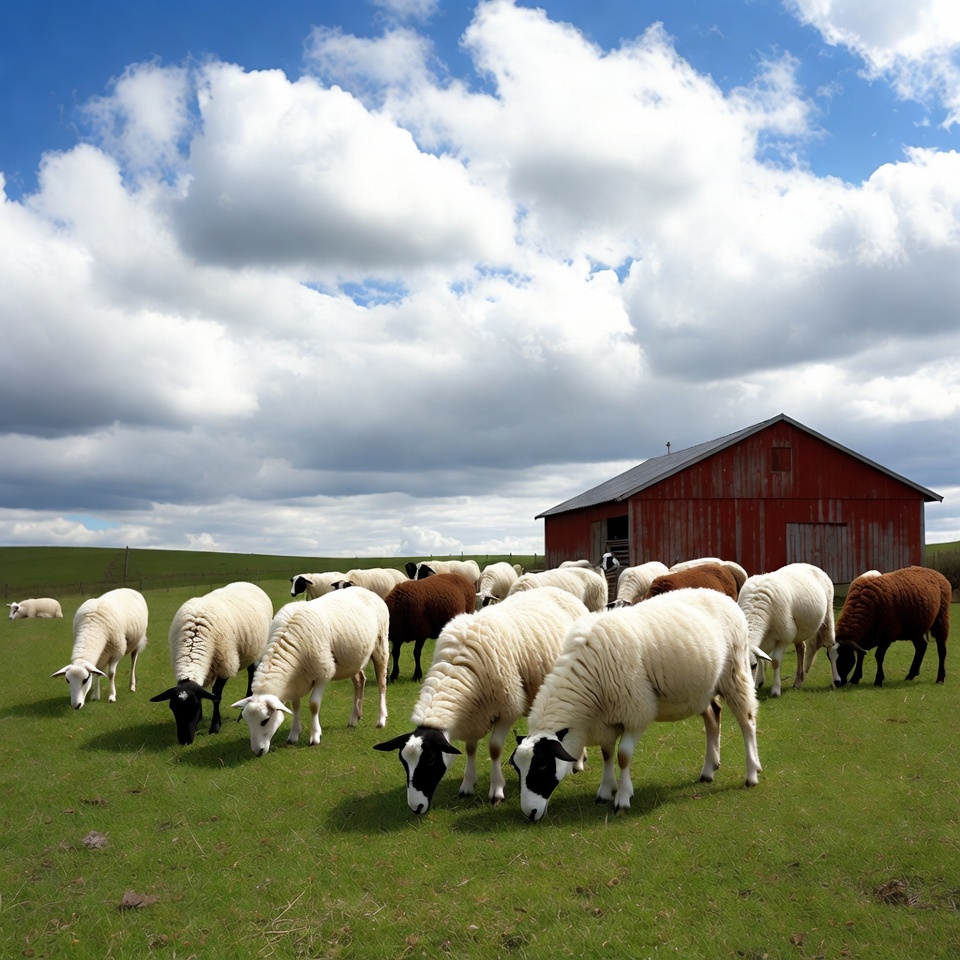 A group of sheep grazes on green grass near a red barn under a blue sky with white clouds. The setting is rural and open.