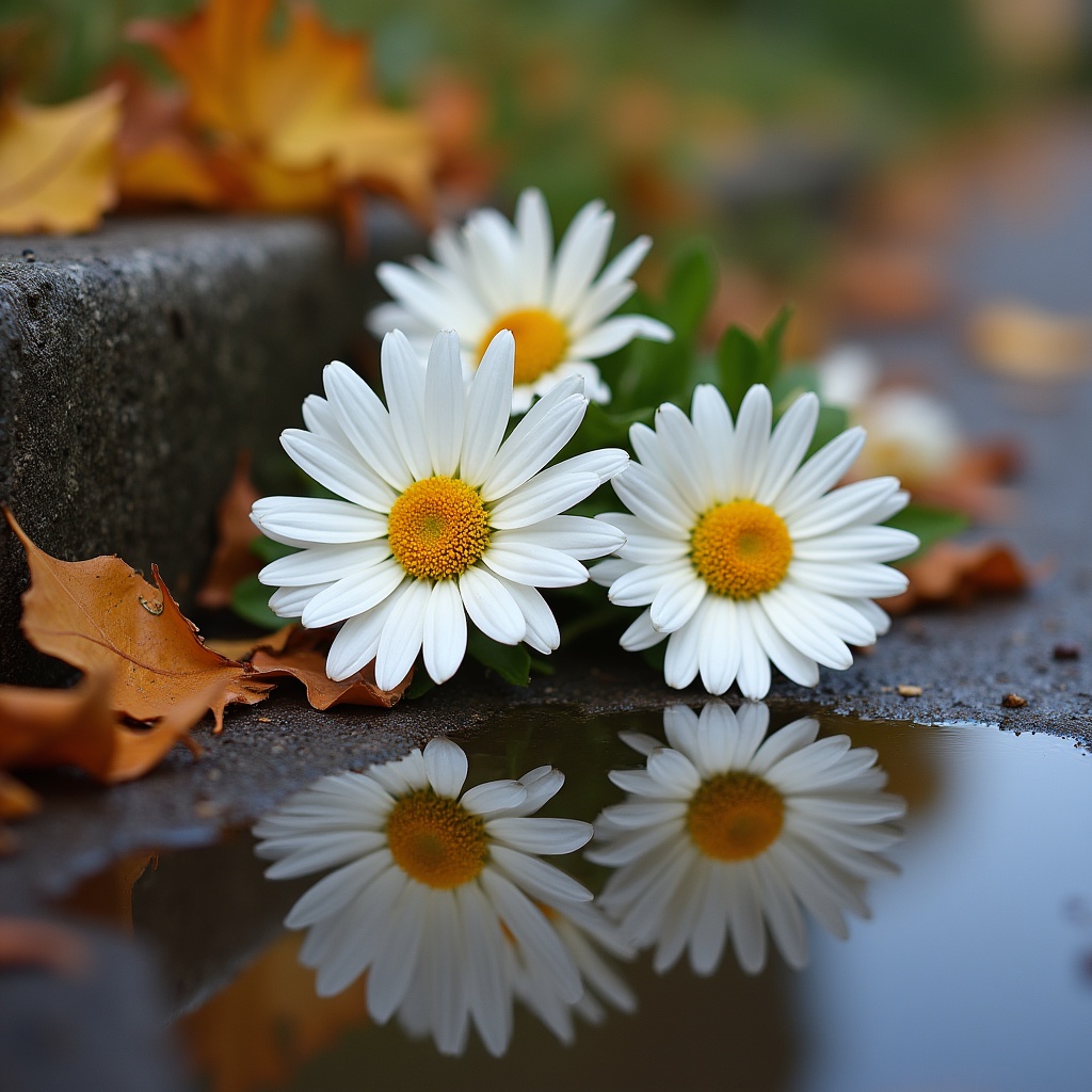 Daisies rest on a wet sidewalk surrounded by fallen leaves. Water reflects the flowers and creates a colorful scene in autumn.