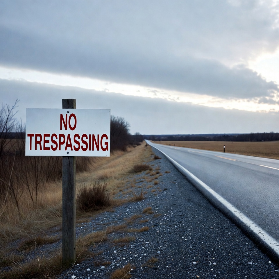 A no trespassing sign stands beside a long and empty road. The sky is cloudy, and the landscape is open fields and grass.