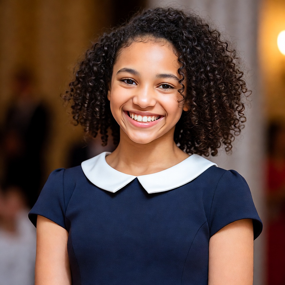A young girl stands smiling at a social event. She wears a dark dress with a white collar and has curly hair.