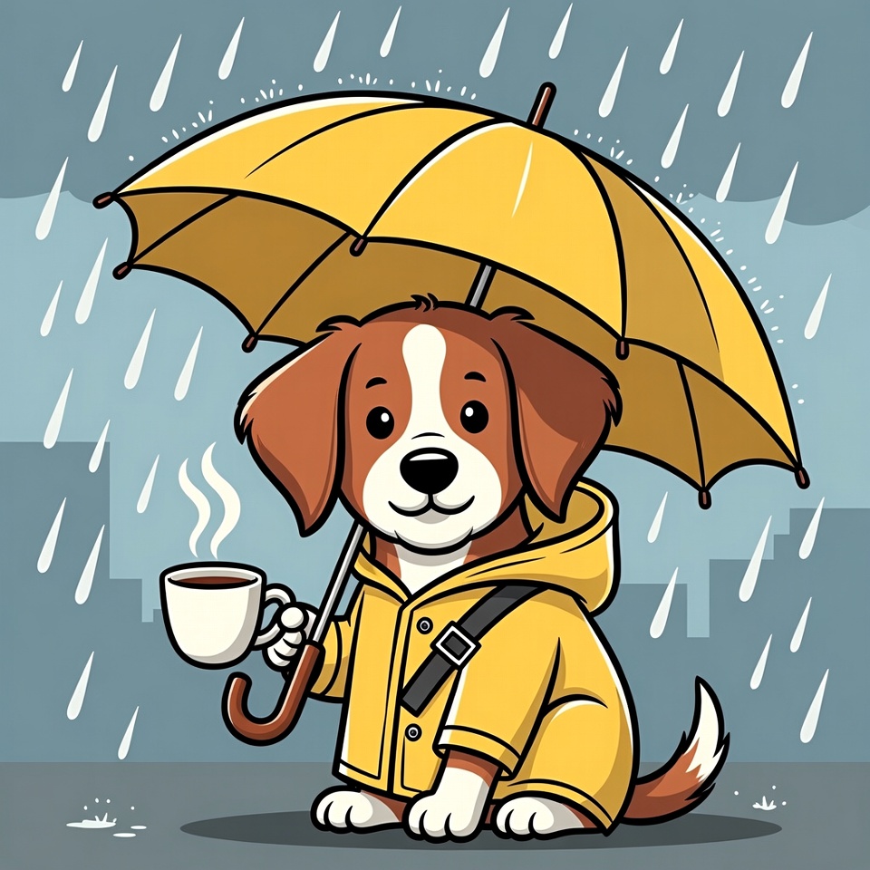 animal, beverage, cartoon, character, city, coat, coffee, cute, dog, drink, happiness, outdoors, pet, playful, rain, raincoat, rainy day, umbrella, weather, yellow