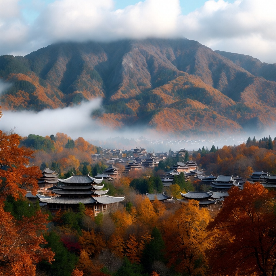 Fog covers the mountain area with trees in autumn colors. Several pagodas are scattered in the valley below the mountains during daytime.