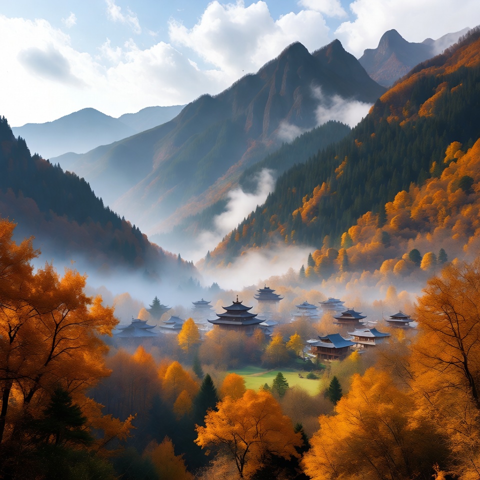 Clouds hover over a village in the mountains during autumn, with colorful trees surrounding traditional buildings and mist in the valley.