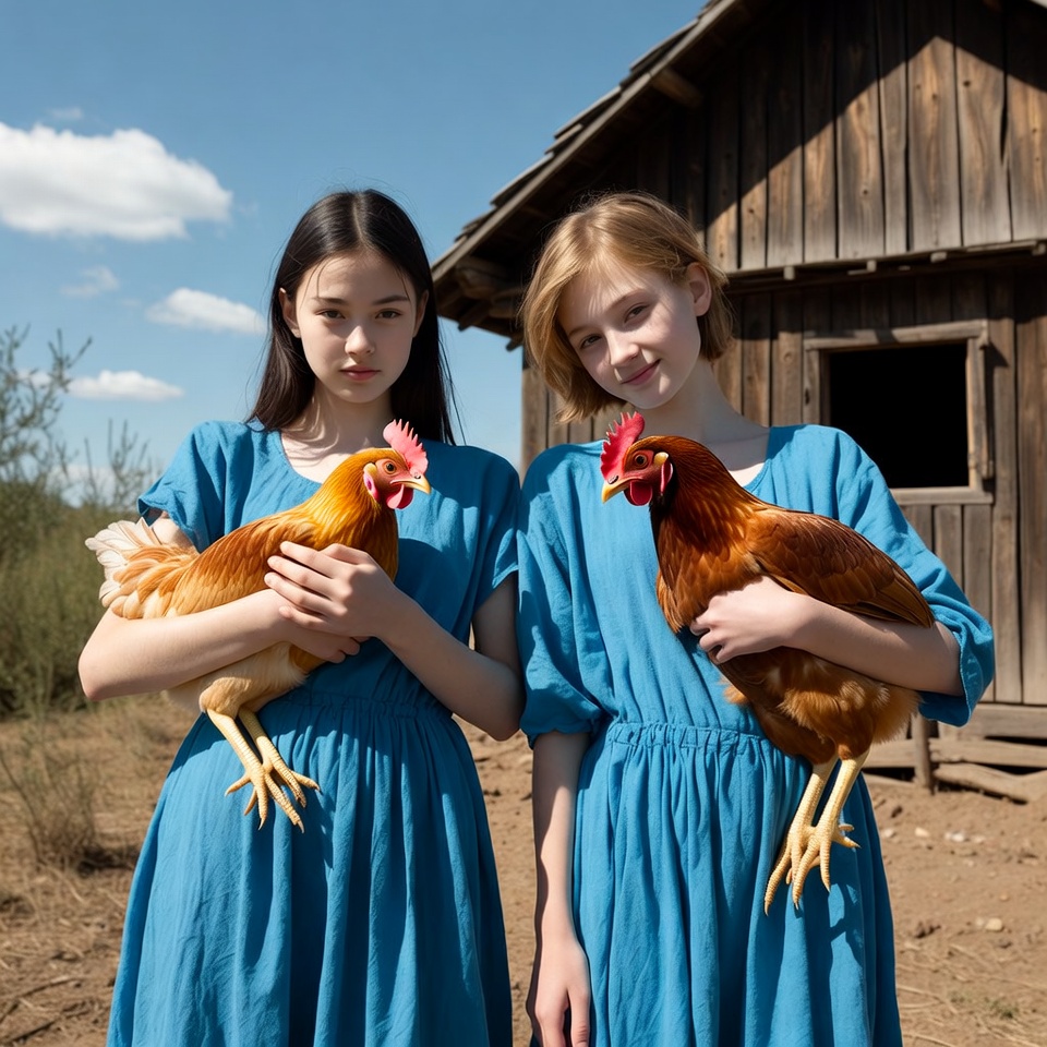 activity, agriculture, animals, blue, building, chickens, country, daytime, dresses, farm, farm life, friendship, girls, holding, nature, outdoor, rural, sky, sunlight, youth