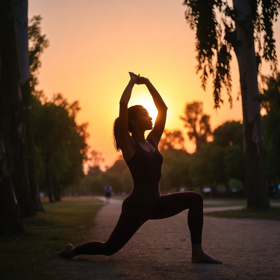 A woman does yoga in a park at sunset. The sun sets behind her, creating a silhouette as she holds a pose among trees.